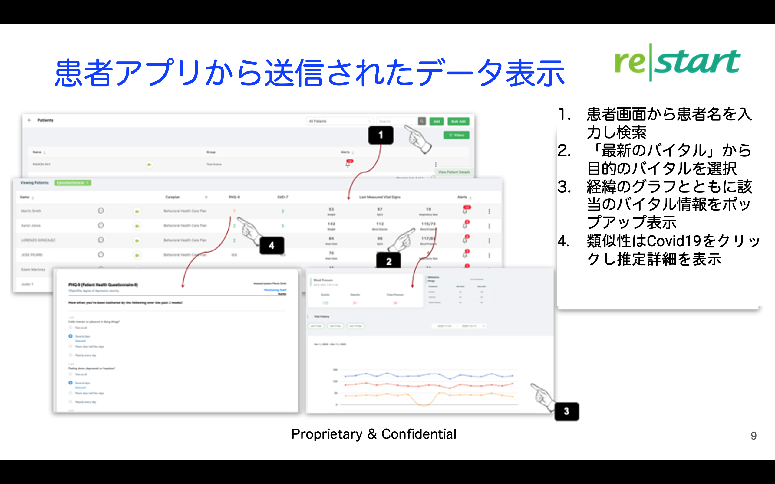 基本はバイタルのIoT自動収集と臨床検査データを蓄積し、データの自動分析と、治療計画に基づくコンプライアンス状況のモニターと管理、介入です。